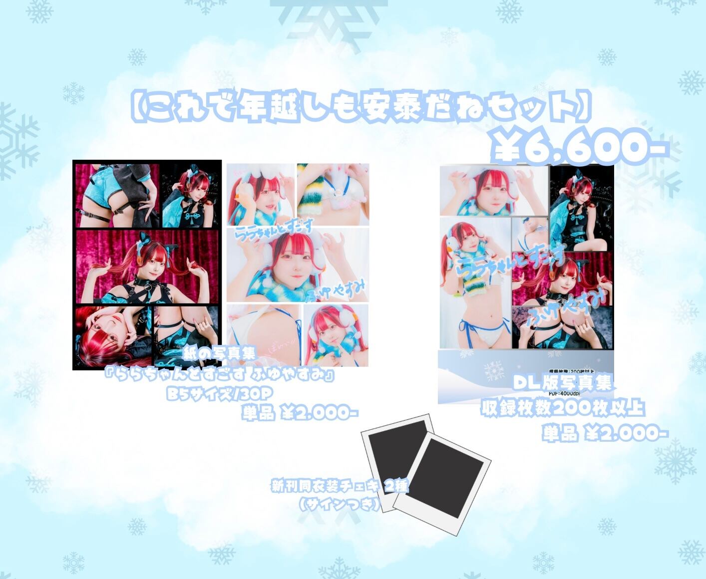 冬感の出るセットとビキニにマフラーとイヤマフを組み合わせたのと、今年の干支である馬イメージのM企画さんの素敵なクール系の衣装でオリジナル写真集なので是非お迎えして下さい♡